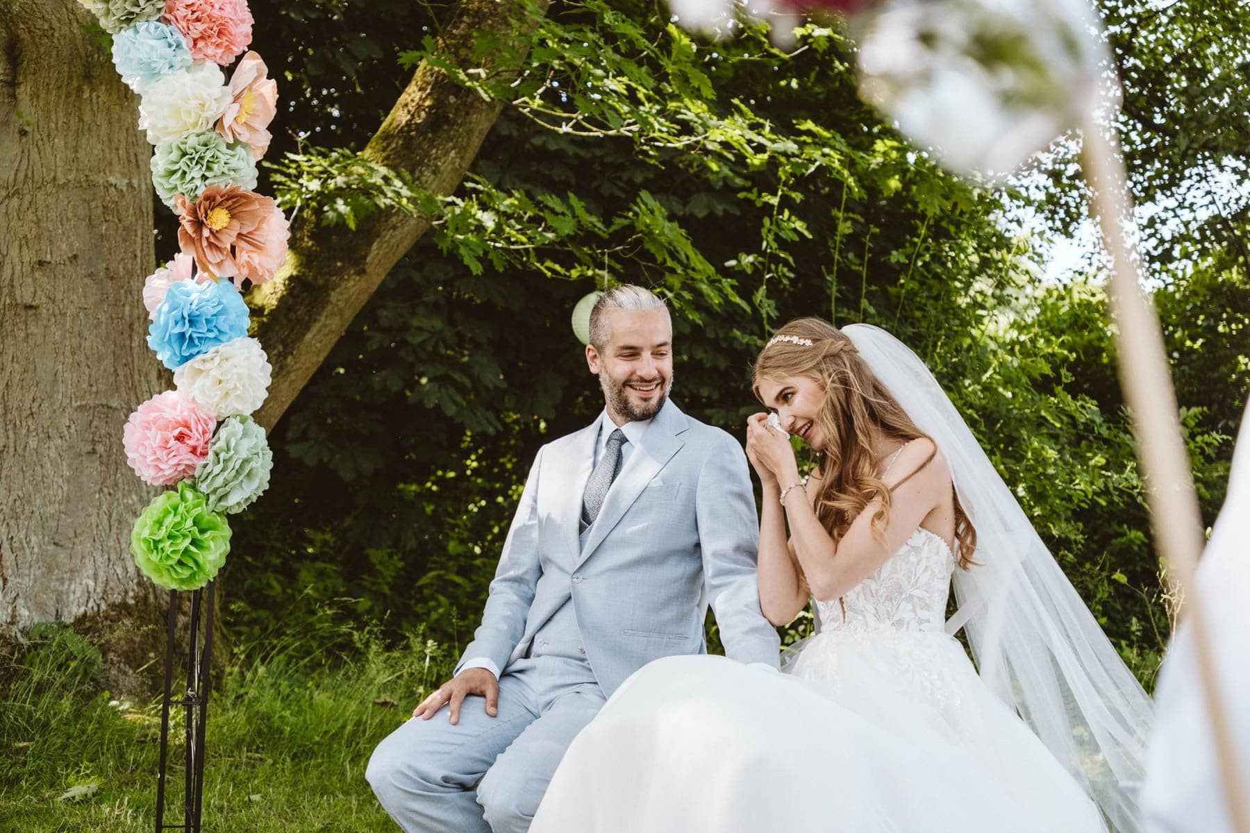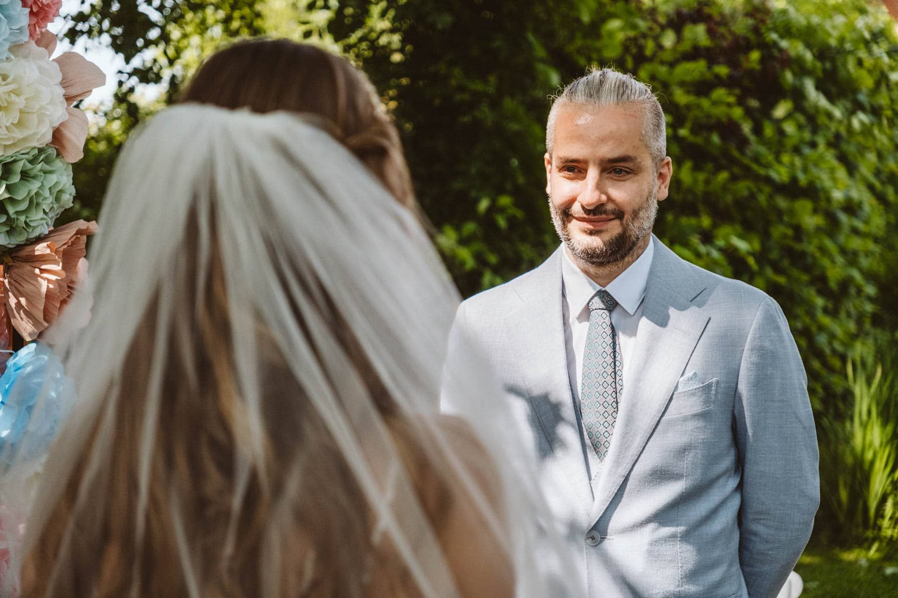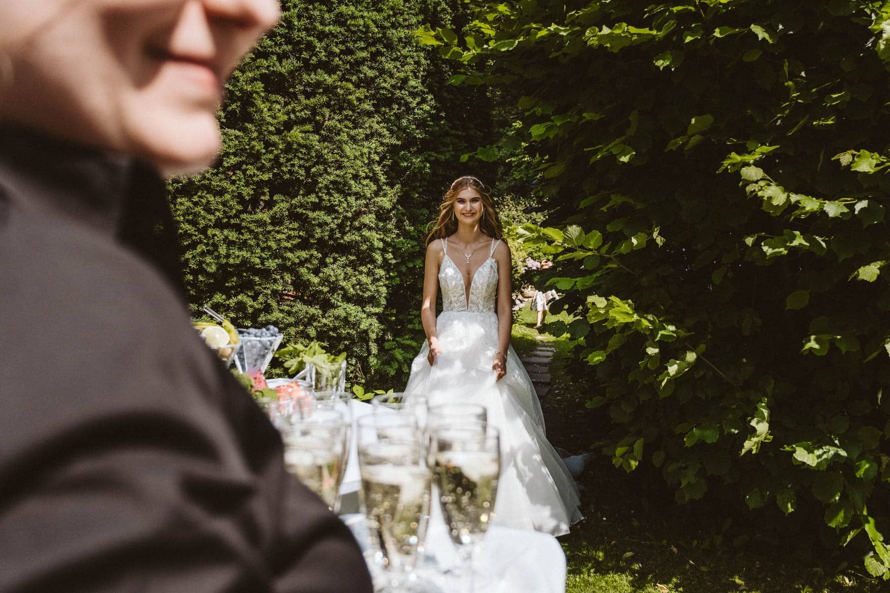 Dann kam der Moment, der so viel Energie freisetzte: der First Look. Arian wartete gespannt mit den Gästen unter einem großen, schattenspendenden Baum. Marie hatte etliche Meter zu überwinden, bis sie bei ihm ankam. Diese weite Strecke gab nicht nur Arian, sondern auch allen Gästen genug Zeit, die volle Schönheit der Braut zu genießen. Die Erleichterung und die Emotionen in Arians Gesicht, als sie bei ihm war, waren unbezahlbar.