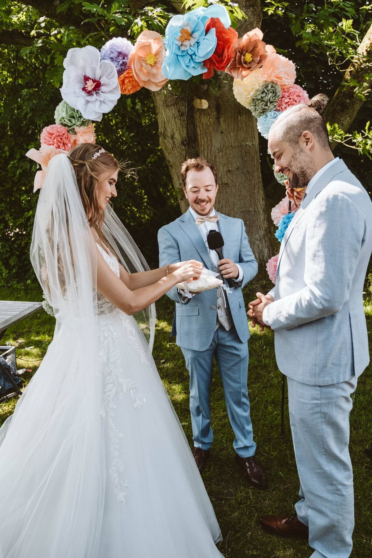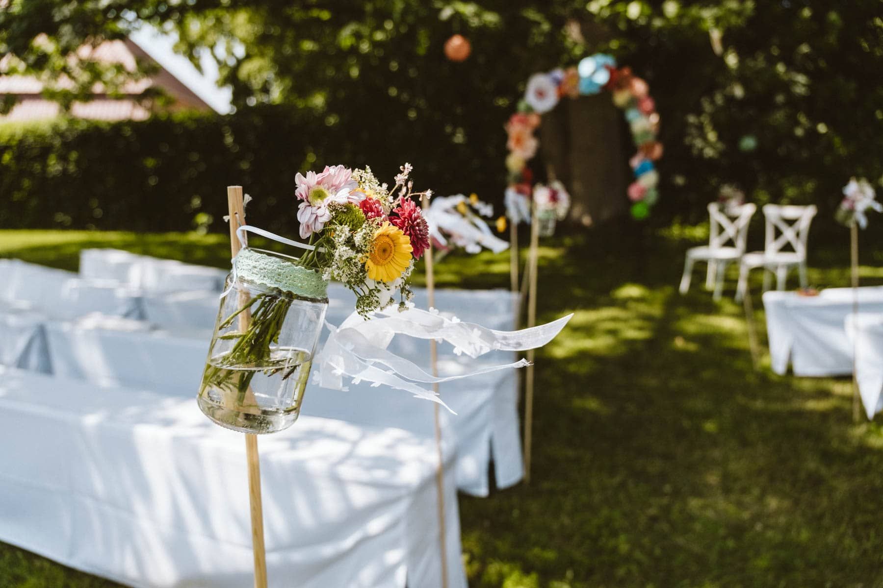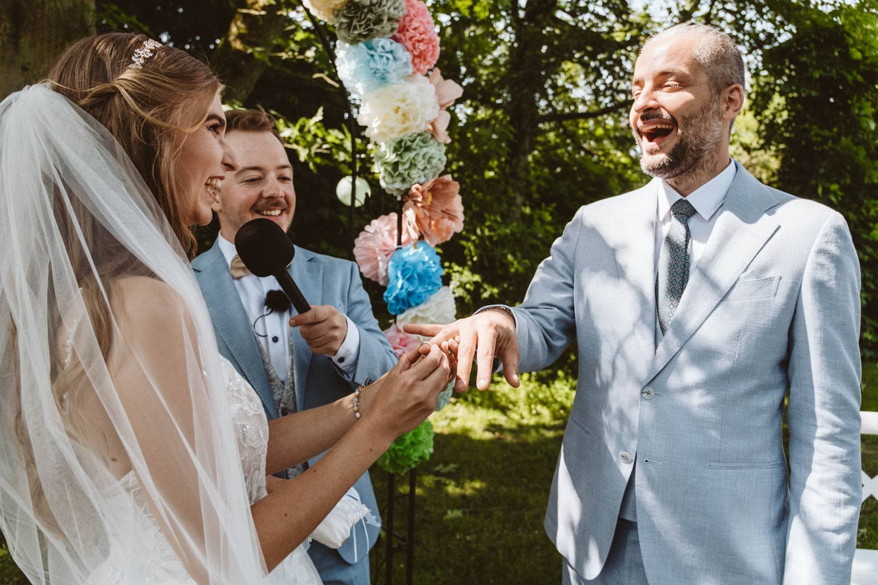 Dann kam der Moment, der so viel Energie freisetzte: der First Look. Arian wartete gespannt mit den Gästen unter einem großen, schattenspendenden Baum. Marie hatte etliche Meter zu überwinden, bis sie bei ihm ankam. Diese weite Strecke gab nicht nur Arian, sondern auch allen Gästen genug Zeit, die volle Schönheit der Braut zu genießen. Die Erleichterung und die Emotionen in Arians Gesicht, als sie bei ihm war, waren unbezahlbar.