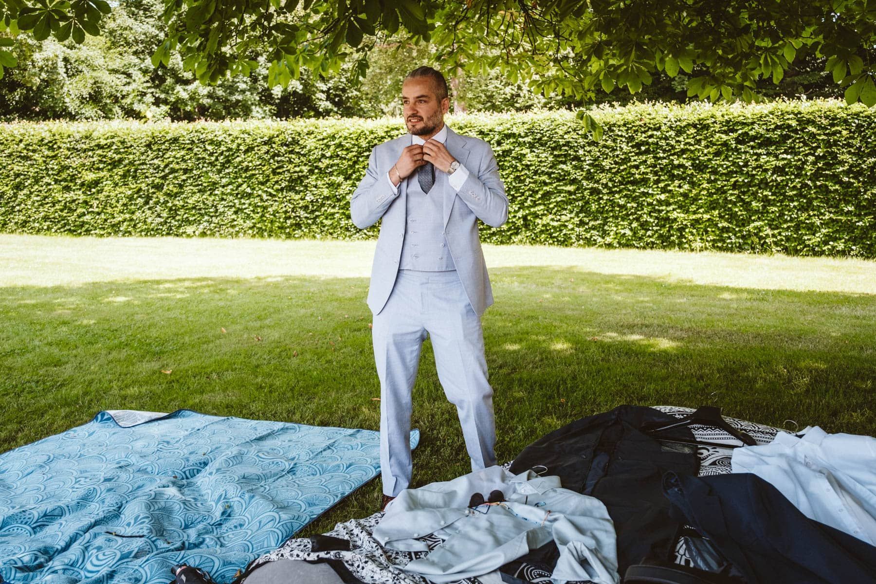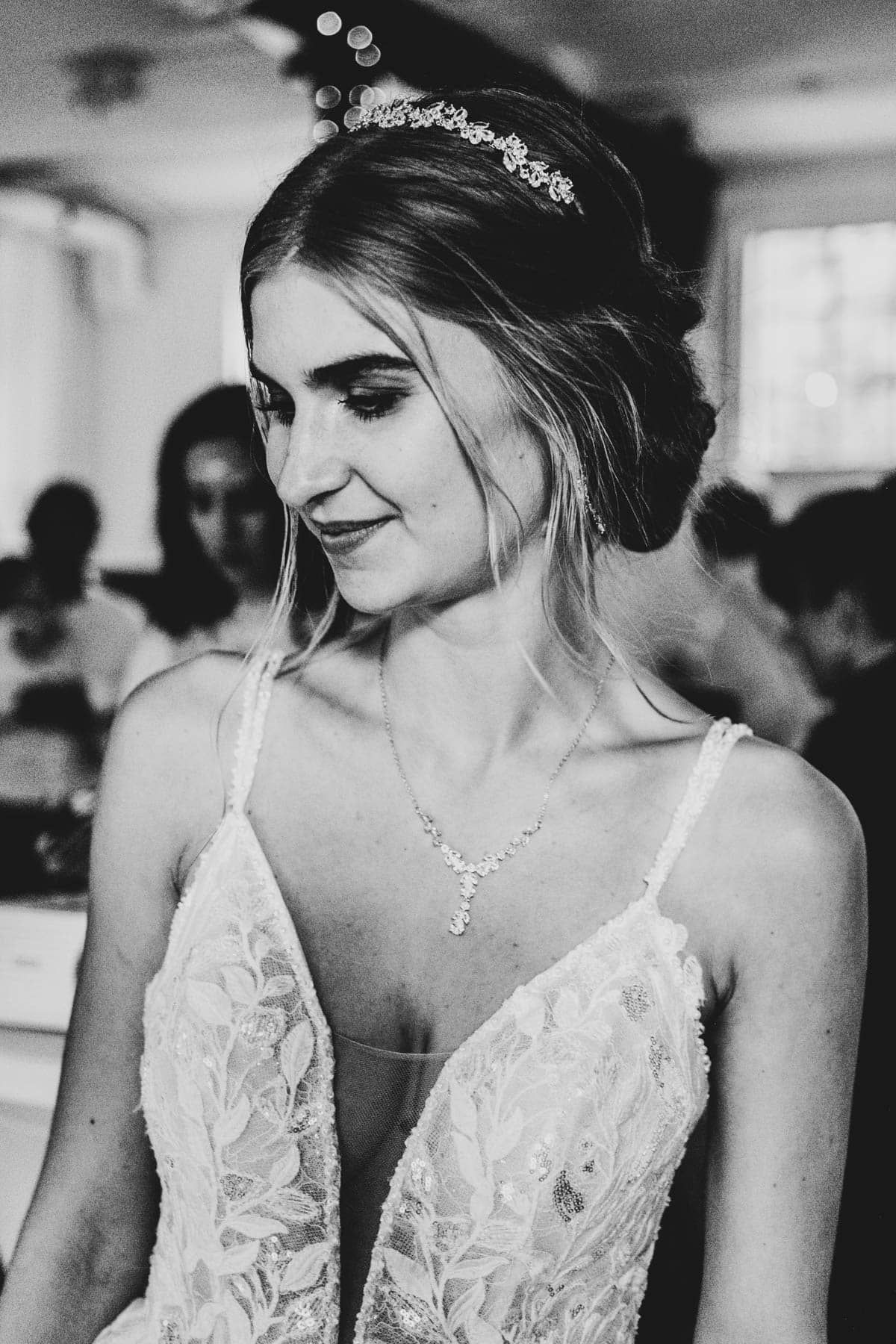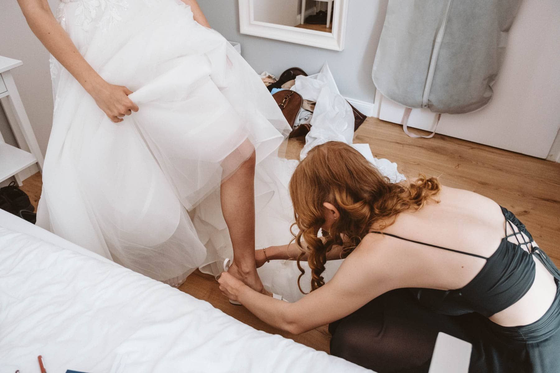 Das Gut Basthorst ist ein Ort, der mit seinen weitläufigen Wiesen, historischen Gebäuden und umgebauten Ställen eine ganz eigene, entspannte Atmosphäre schafft. Man kann dort nicht nur fantastisch feiern, sondern auch direkt übernachten und die Zeit in vollen Zügen genießen. Genau diese Ruhe spürte ich, als das Getting Ready von Marie und Arian begann. Obwohl ein gewisser Trubel zu jeder Hochzeit dazugehört, verlief dieser Morgen vollkommen entspannt und ohne Hektik. Als Reportage-Hochzeitsfotograf für Gut Basthorst habe ich diese authentischen und ruhigen Momente der Vorbereitung im Bild festgehalten.