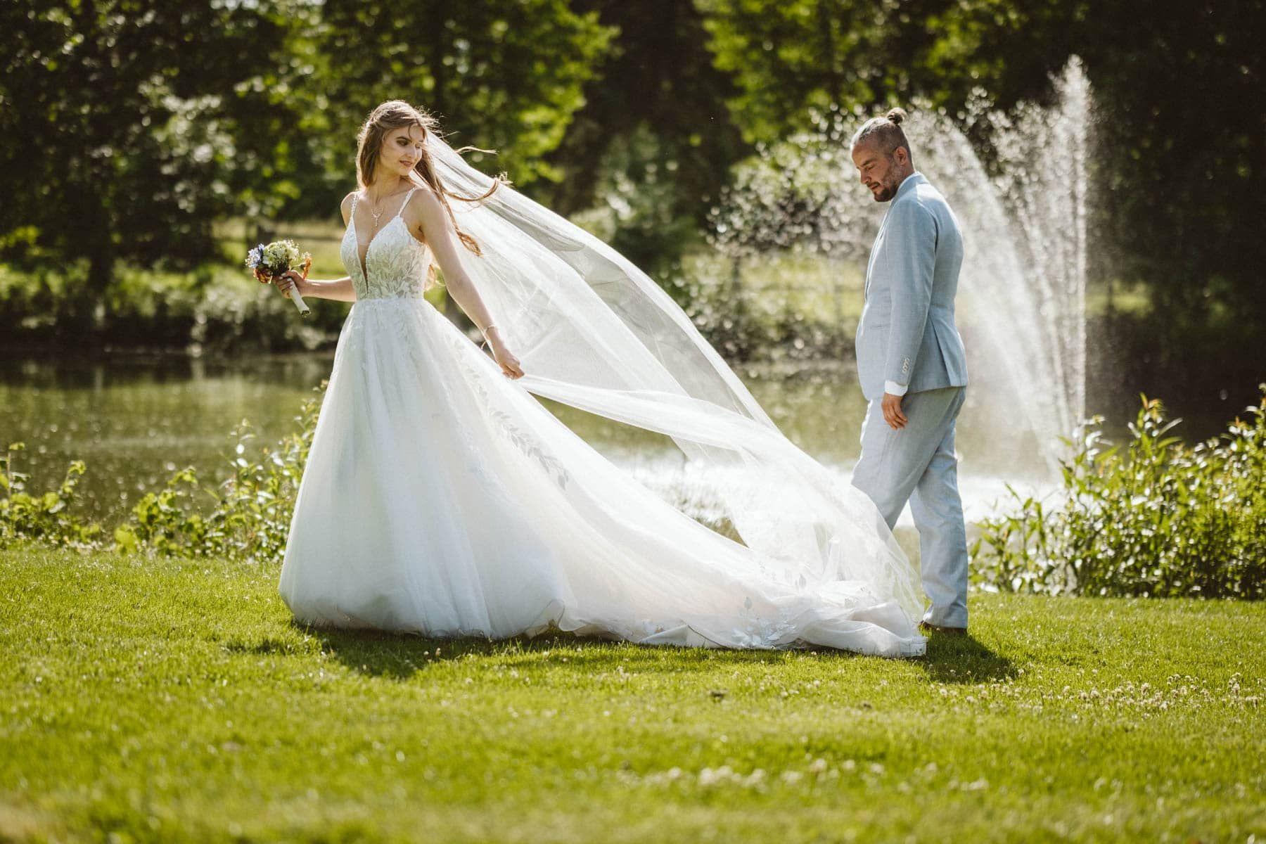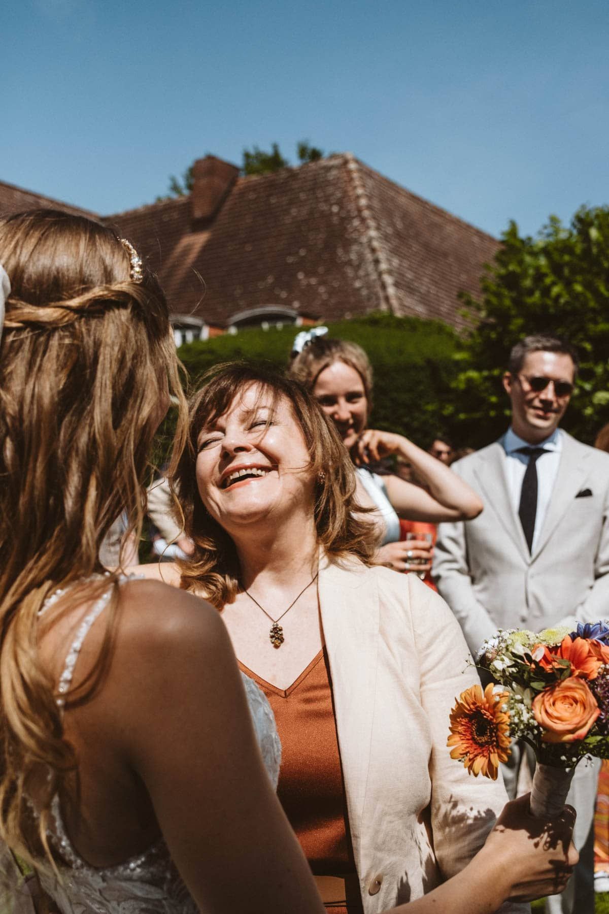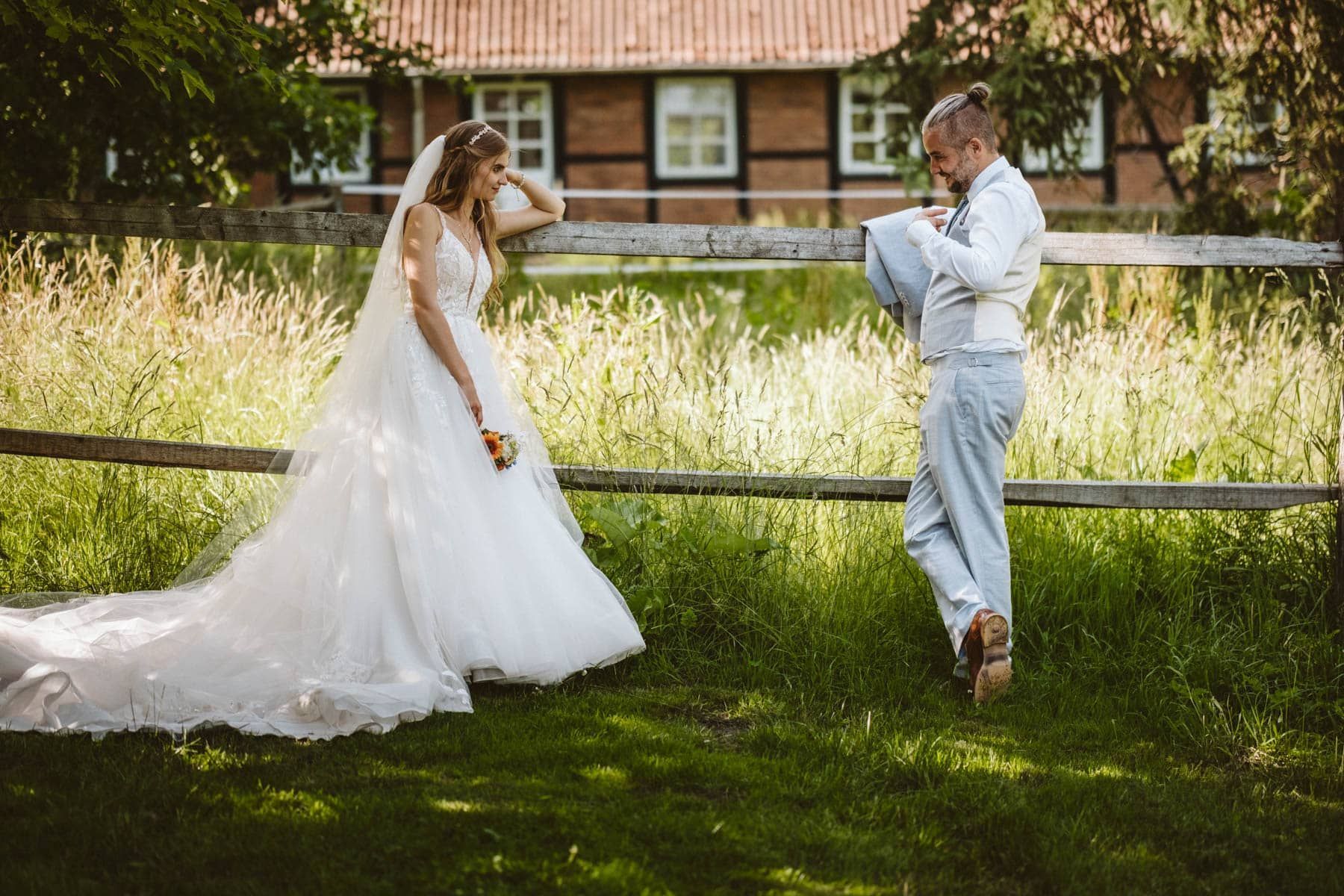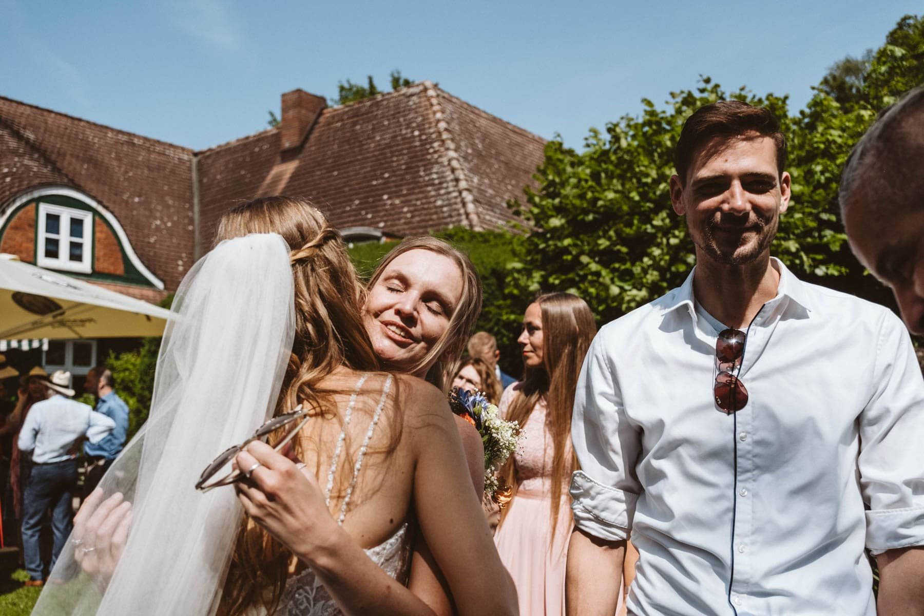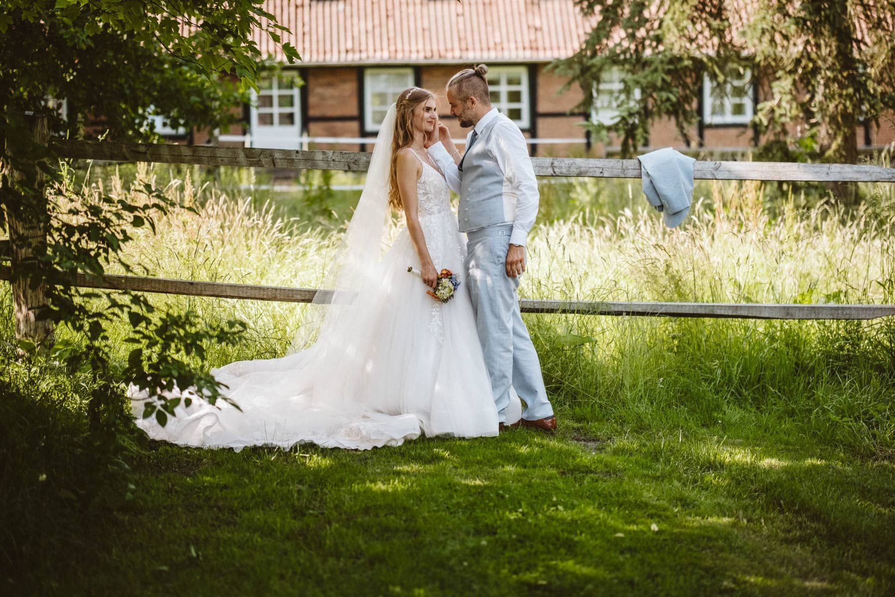 Nach der Trauung gab es einen entspannten Sektempfang, gefolgt von Gratulationen und dem Torte anschneiden. Die Stimmung bei allen Gästen war gelöst und locker. Für das Paarshooting nutzten wir die weitläufigen Flächen des Guts.